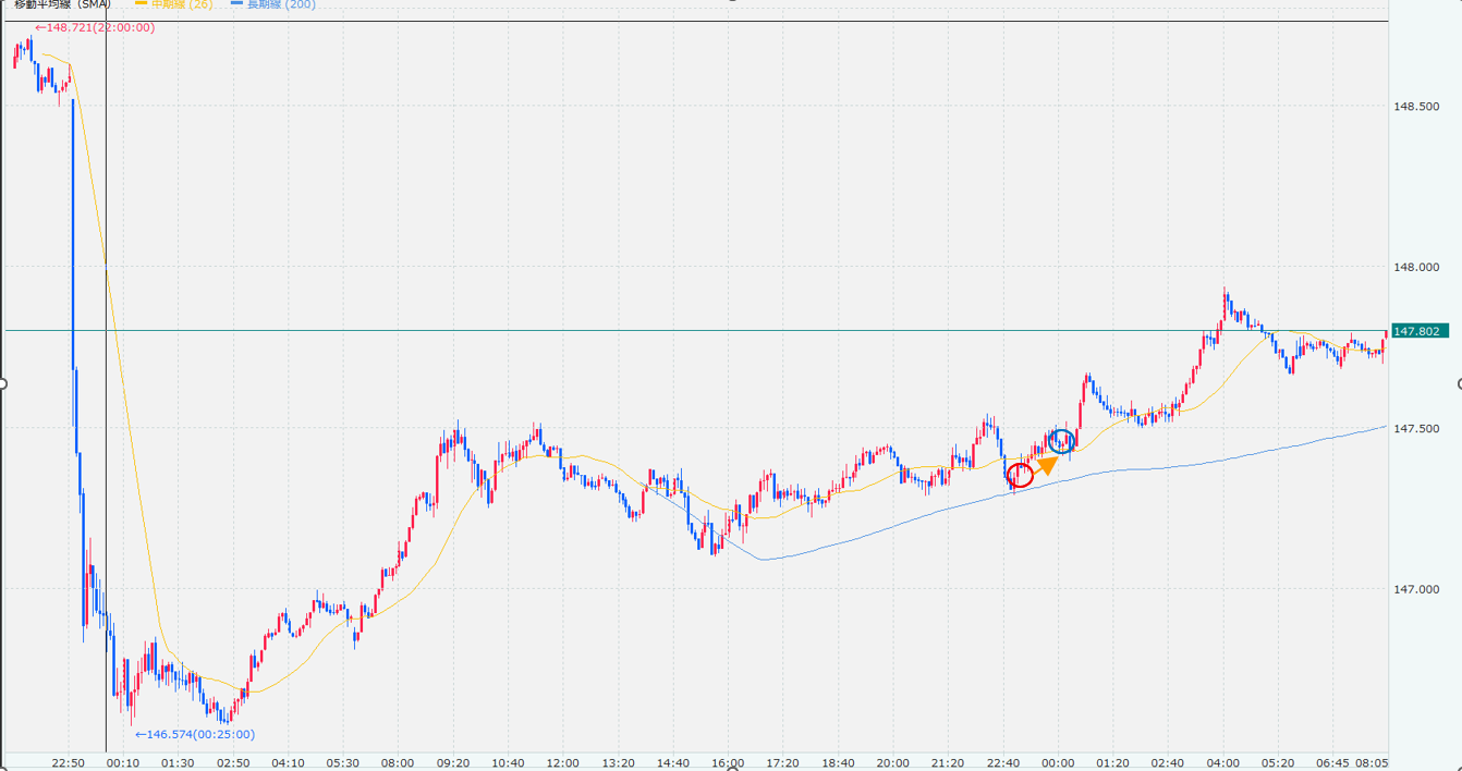 23時頃の下押しを拾って入ったけど、決済は147.50前後を意識してサクッと利確。