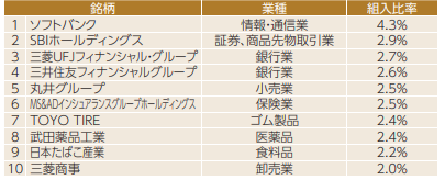 通信・金融・保険・製造業などに分散され、安定した配当を出す企業が中心です。