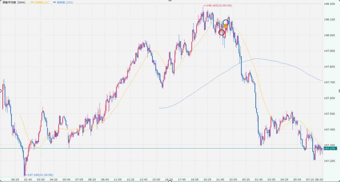 - ドル円は148.18の高値をつけた後に反落し147.29まで下落