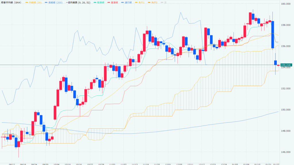 日足の一目均衡表を見ると、現在は雲の下限をサポートに、雲の中で引けている状態。