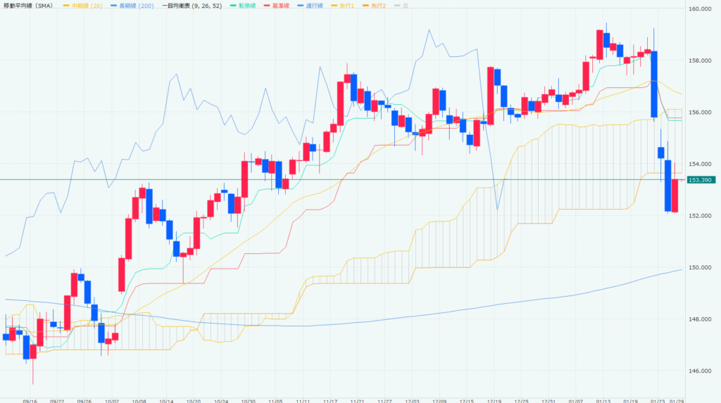 ドル円の日足チャートを見ると、一目均衡表の雲を下抜けしてクローズ。