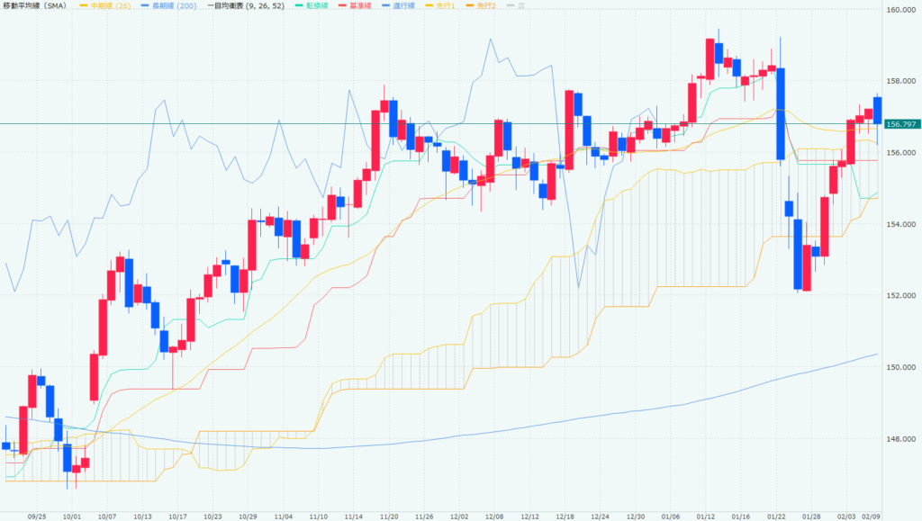 日足・一目均衡表の雲上限(156.24)が機能し、下げ渋る形。
